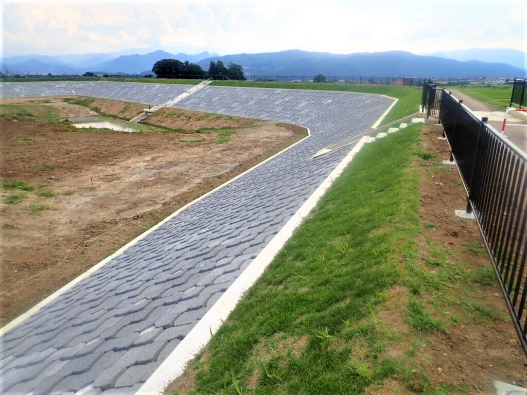 池内斜面の補強のための張りブロック工事に加え、新しく排水施設の設置、