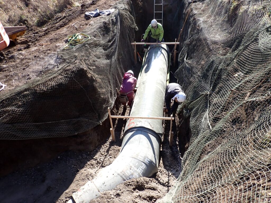 FRPM管という強化プラスチックの管を土中に布設します。