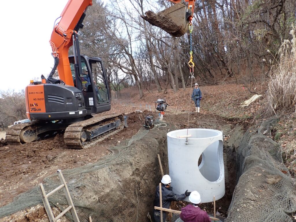用水路の老朽化に伴い、新しく管を入れる工事です。