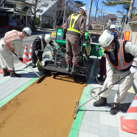 古くなり傷ついた道路の表面を削り取り、新しく舗装を打ち直す工事です。
